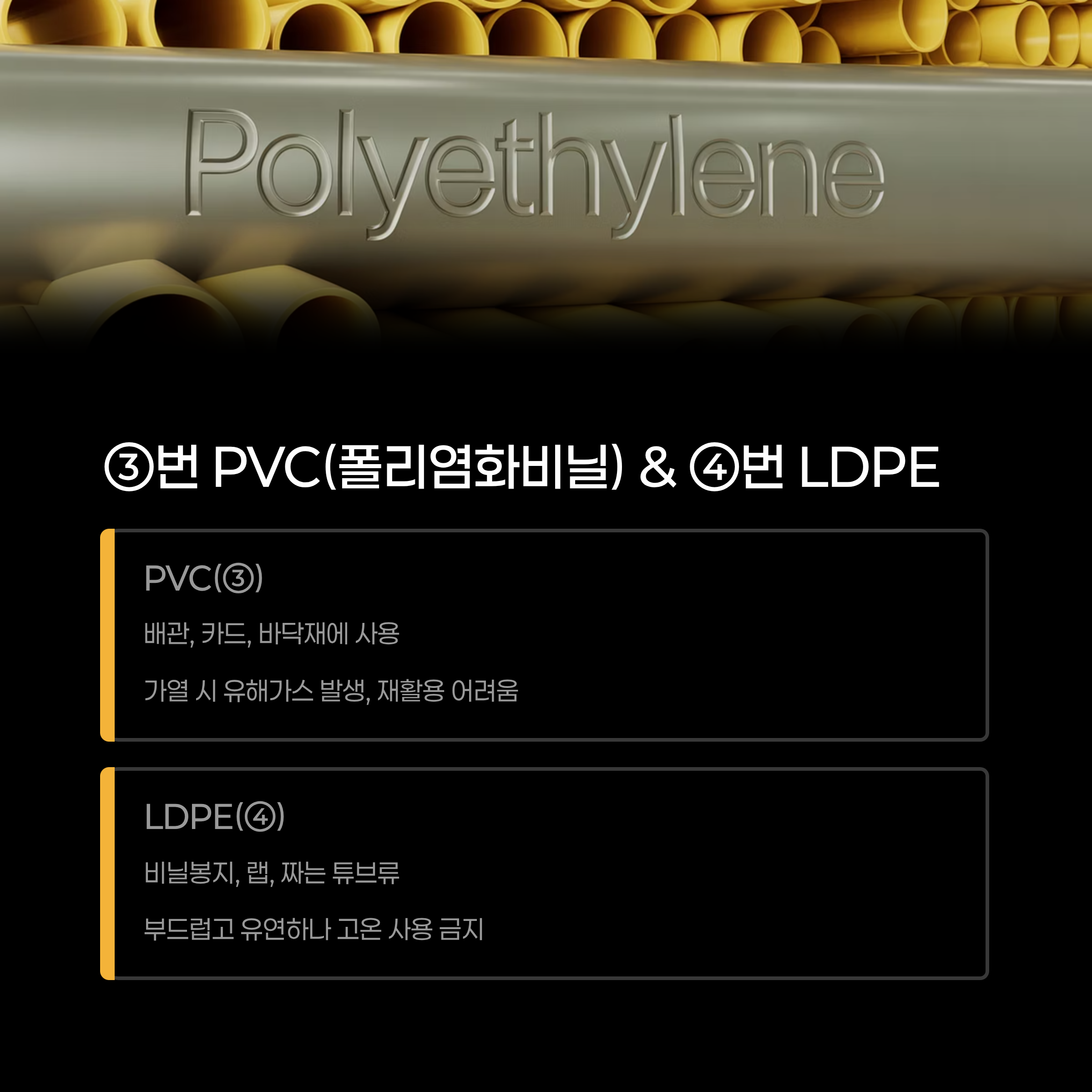 | ③번 | PVC | 배관, 바닥재 | 재활용 어려움 | 가열 시 유해가스 발생 |