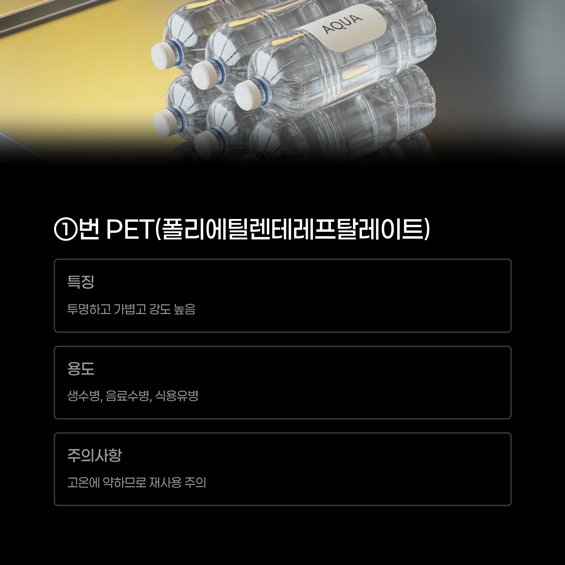 | ①번 | PET | 생수병, 음료병 | 재활용 가능 | 고온에 약하므로 재사용 주의 |