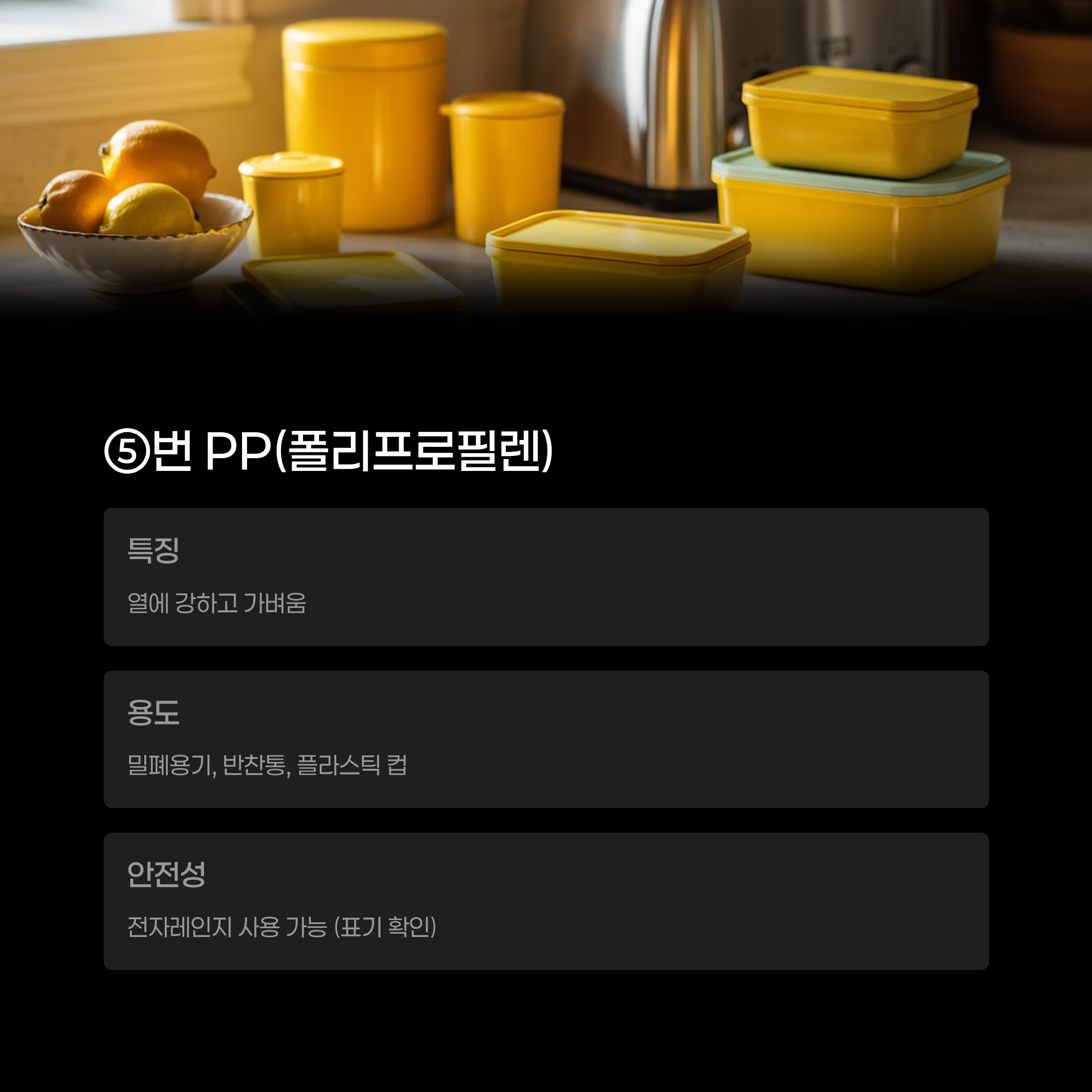 | ⑤번 | PP | 반찬통, 밀폐용기 | 재활용 가능 | 전자레인지 사용 가능 (표기 확인) |