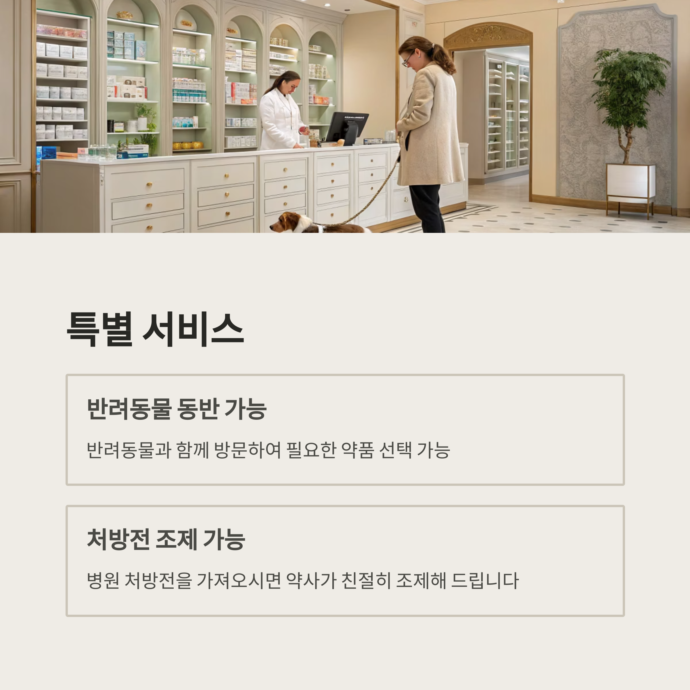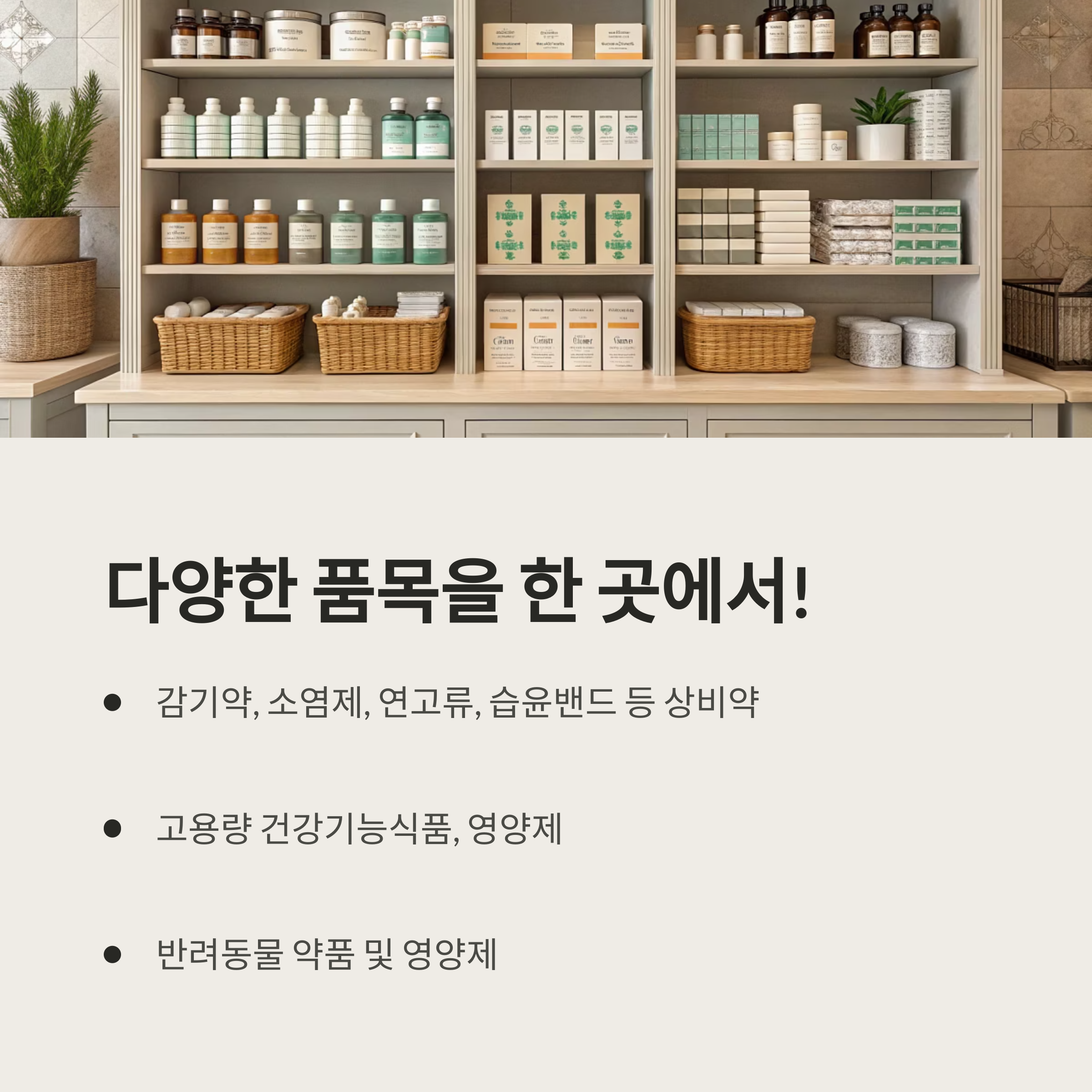 - 반려동물 약품 및 영양제, 생활용품 등도 다양하게 구비