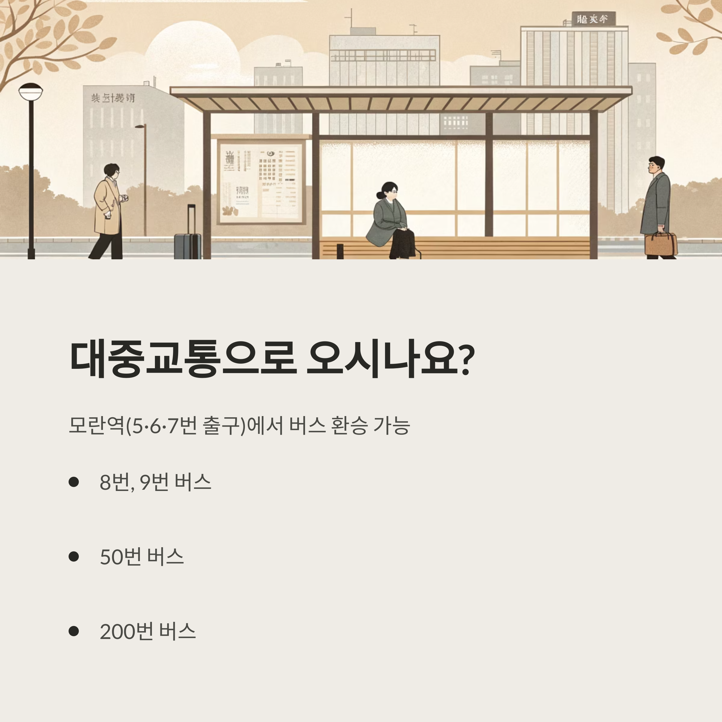 - 대중교통: 모란역(5·6·7번 출구)에서 버스 환승 가능 (8, 9, 50, 200 등 운행)