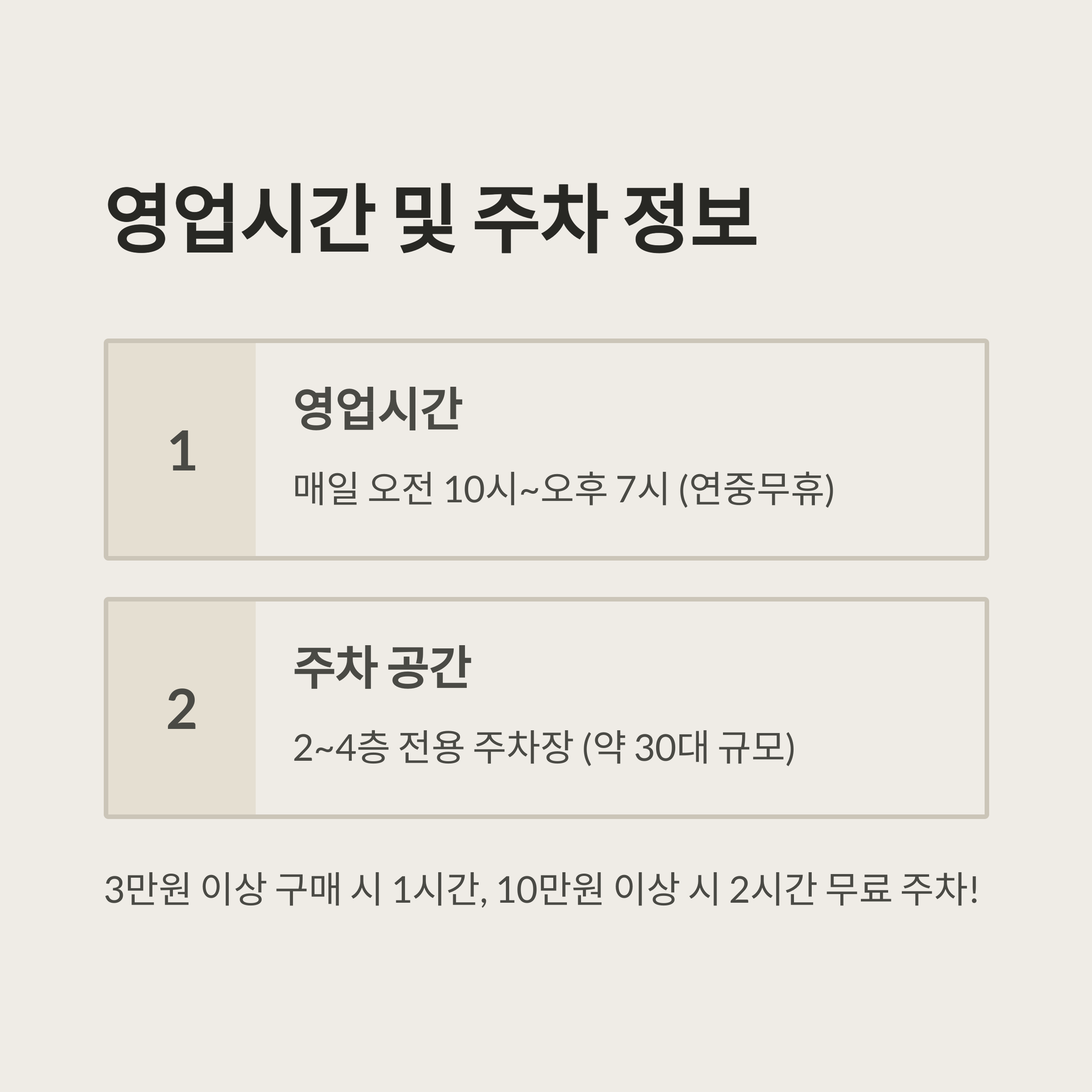 - 3만원 이상 구매 시 1시간, 10만원 이상 시 2시간 무료 주차 가능