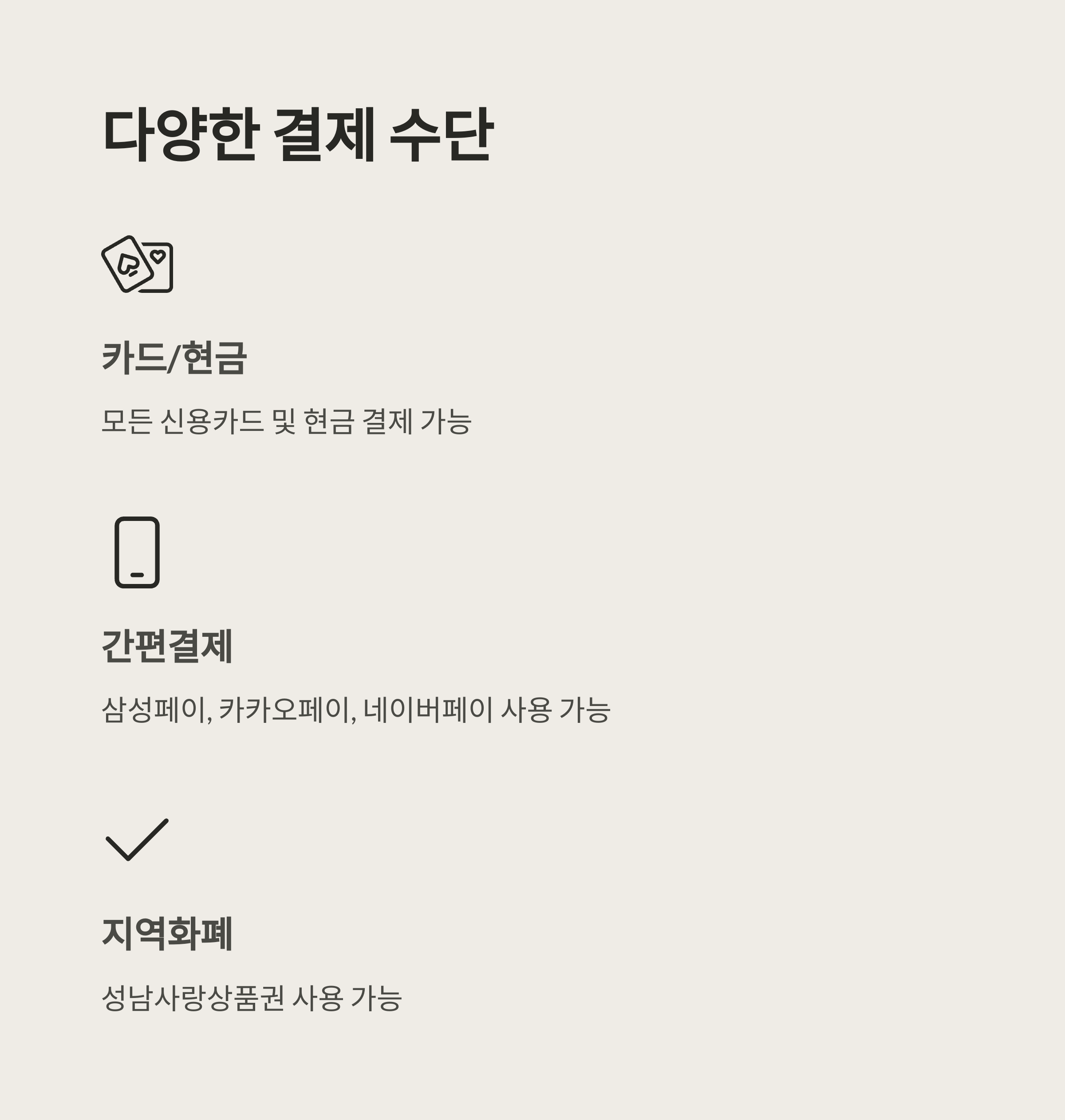 - 결제 수단: 현금, 카드, 삼성페이, 카카오페이, 네이버페이 등 간편결제 모두 가능