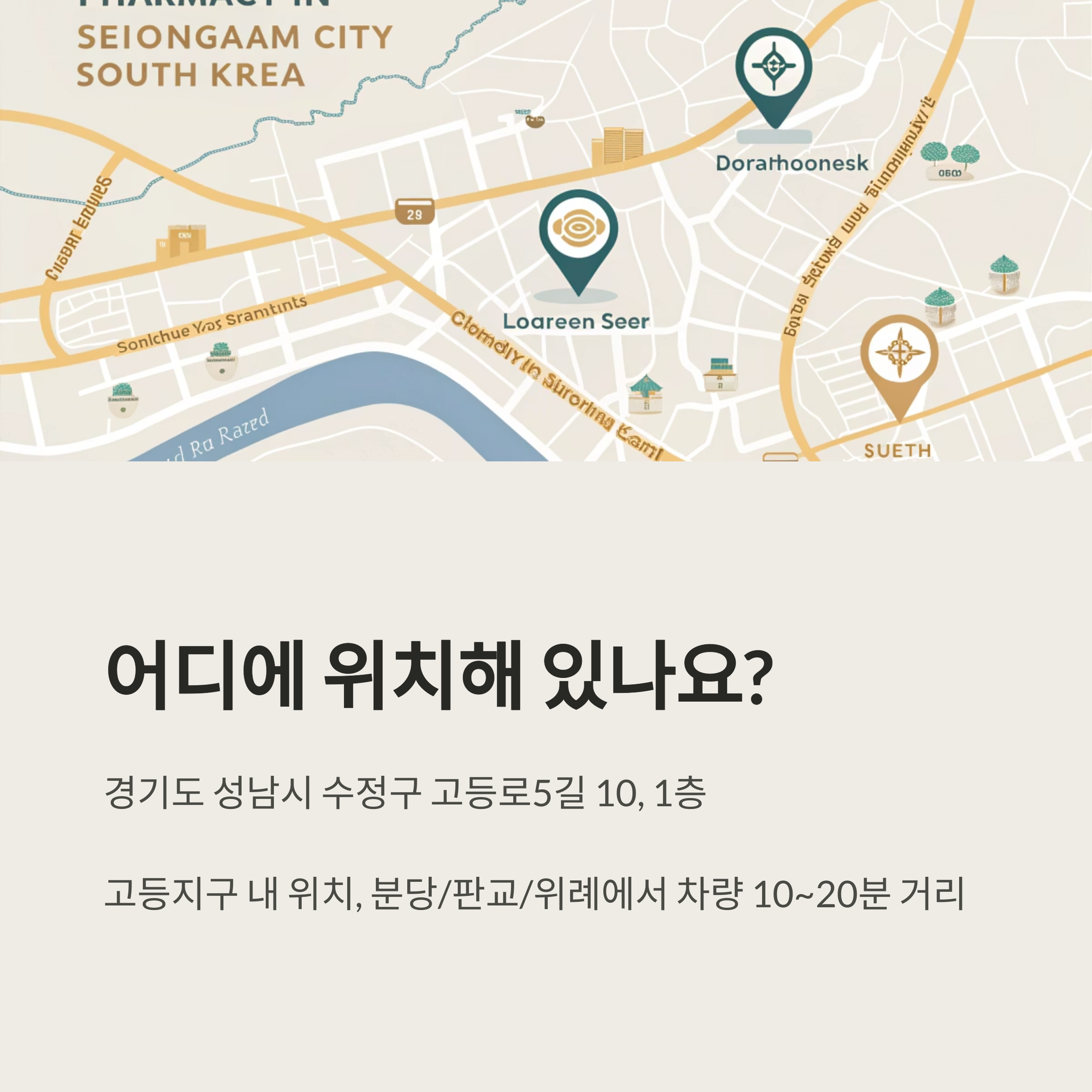 A1. 메가팩토리 약국은 성남시 수정구 고등로5길 10, 1층에 위치해 있습니다. 고등지구 중심에 있어 분당, 판교, 위례 등 인근 지역에서도 접근성이 뛰어납니다.