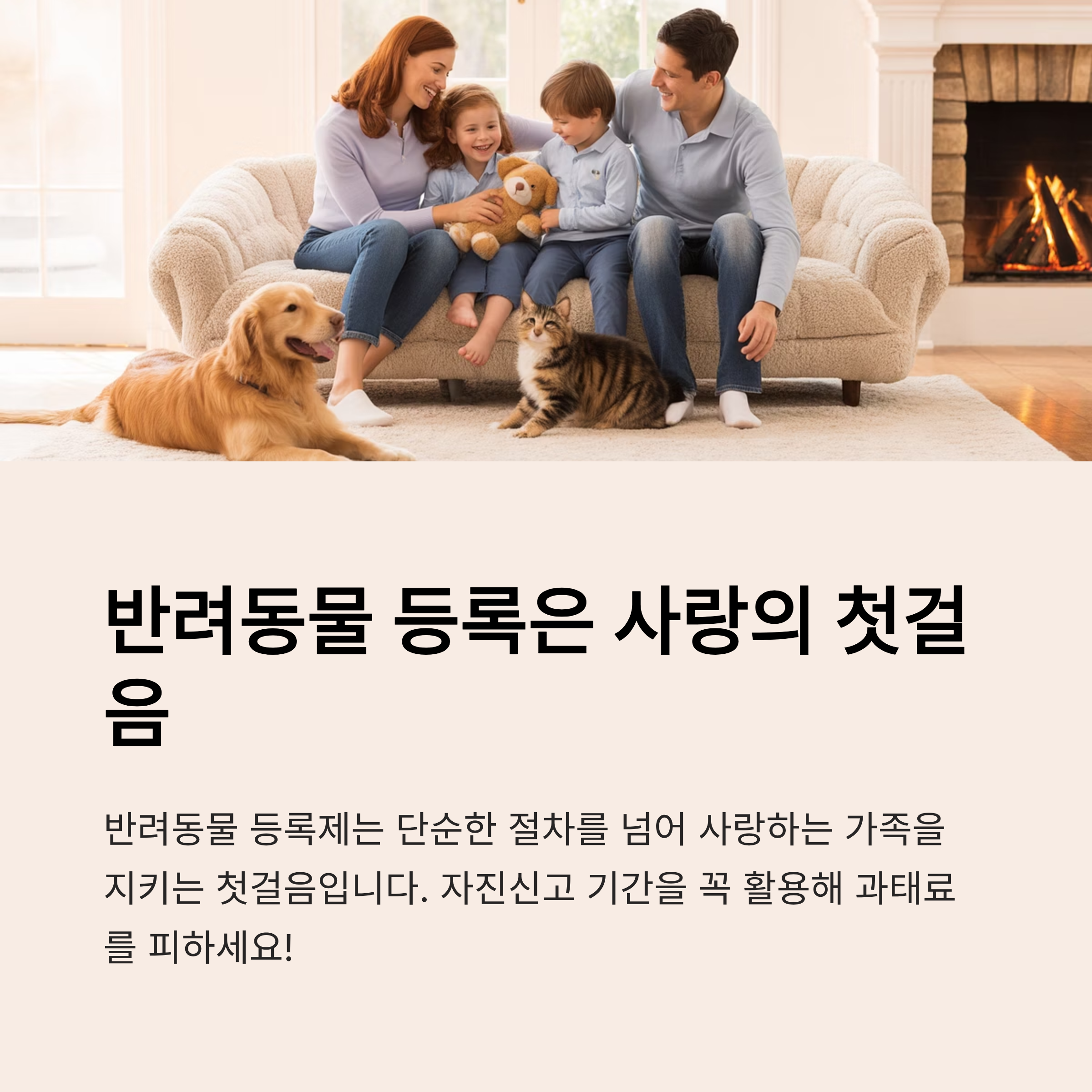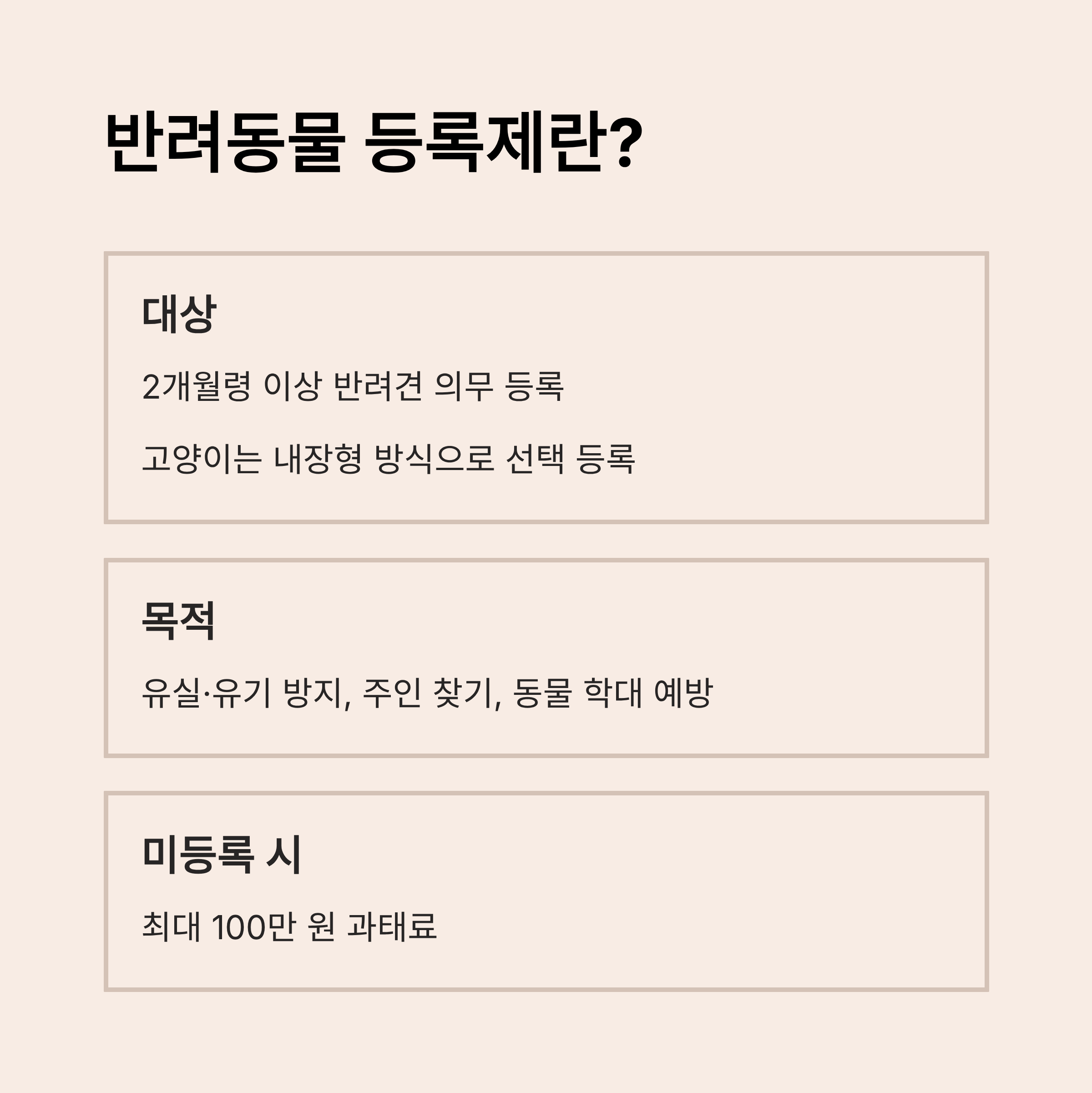 - 등록 의무 대상: 반려견(2개월령 이상), 고양이(선택 등록 내장형)