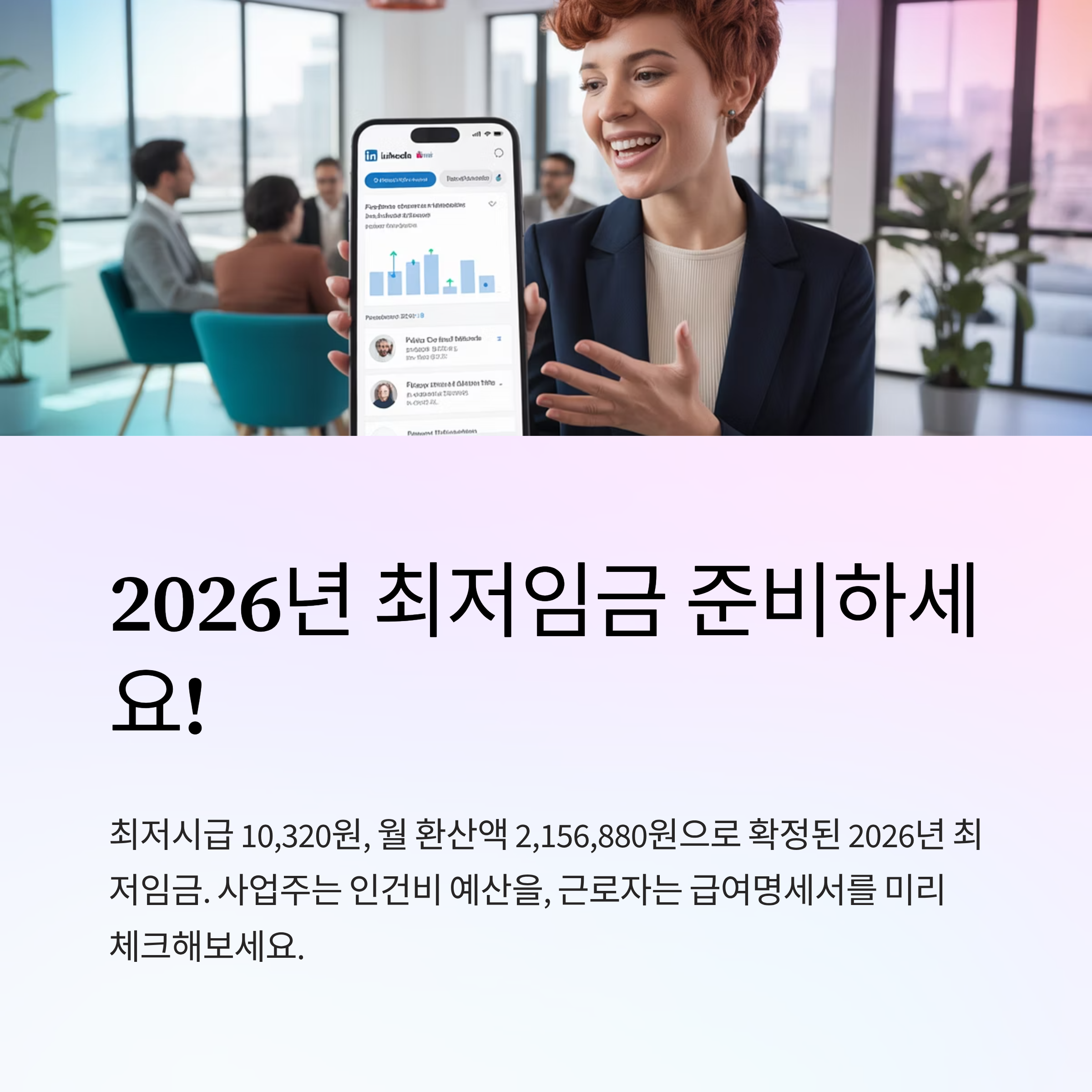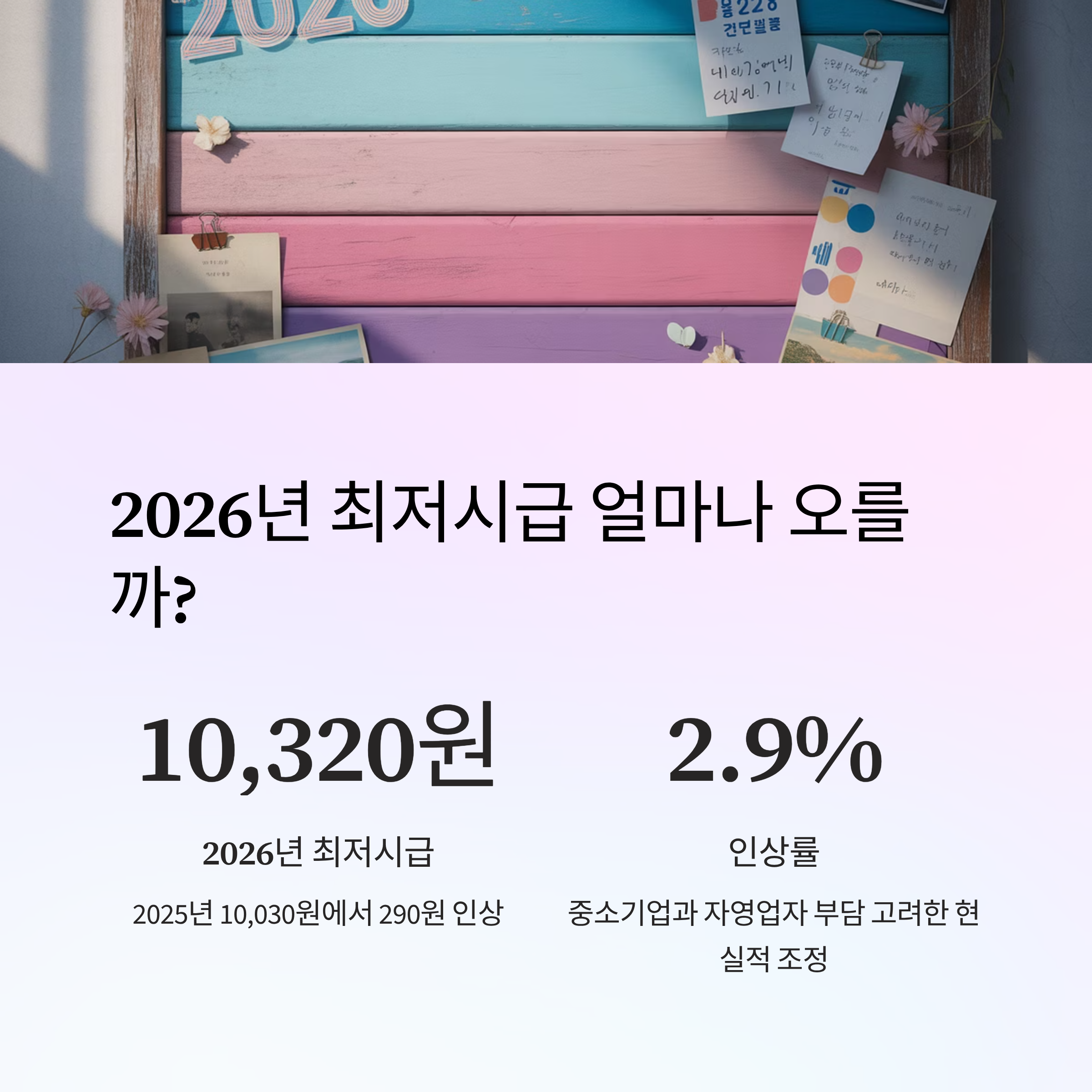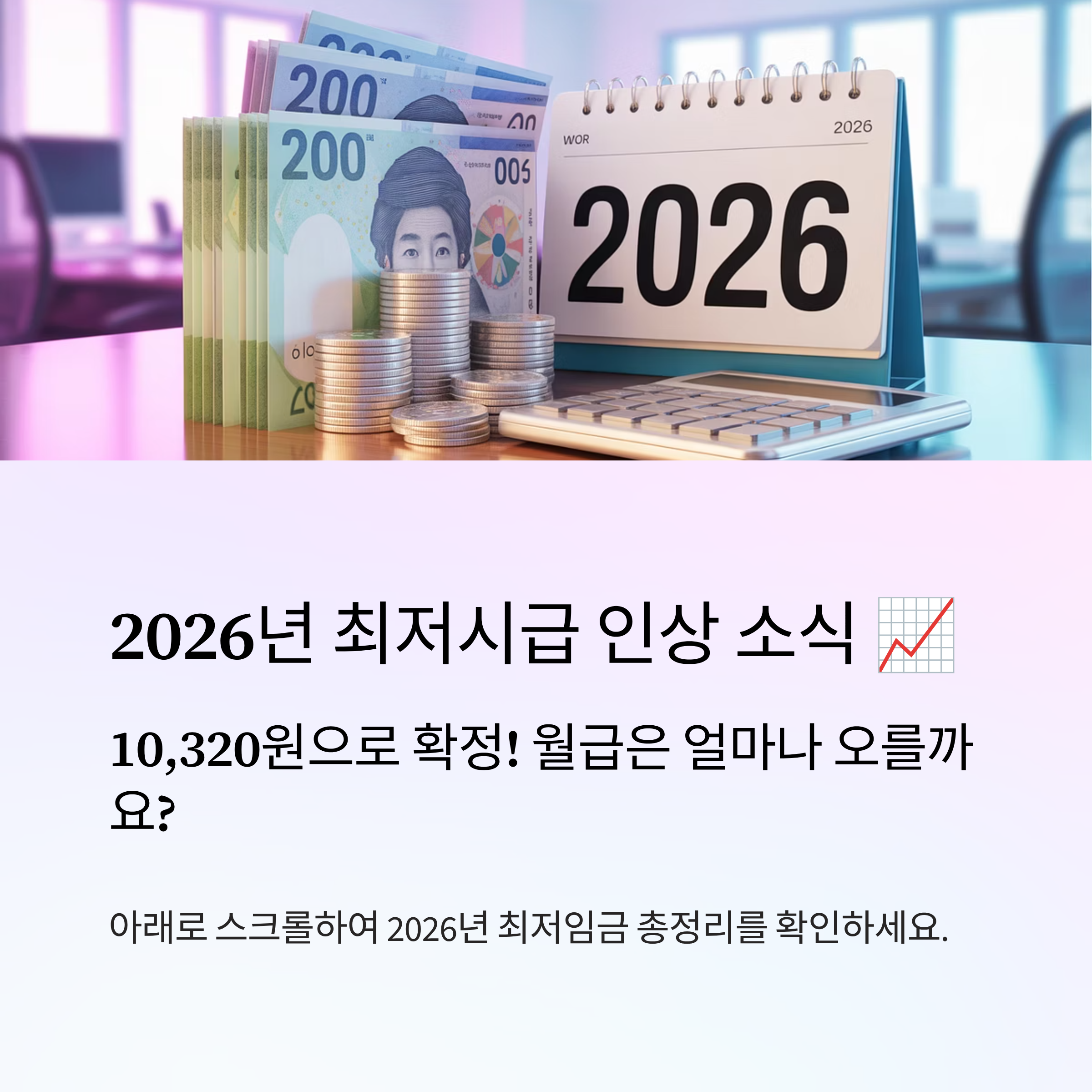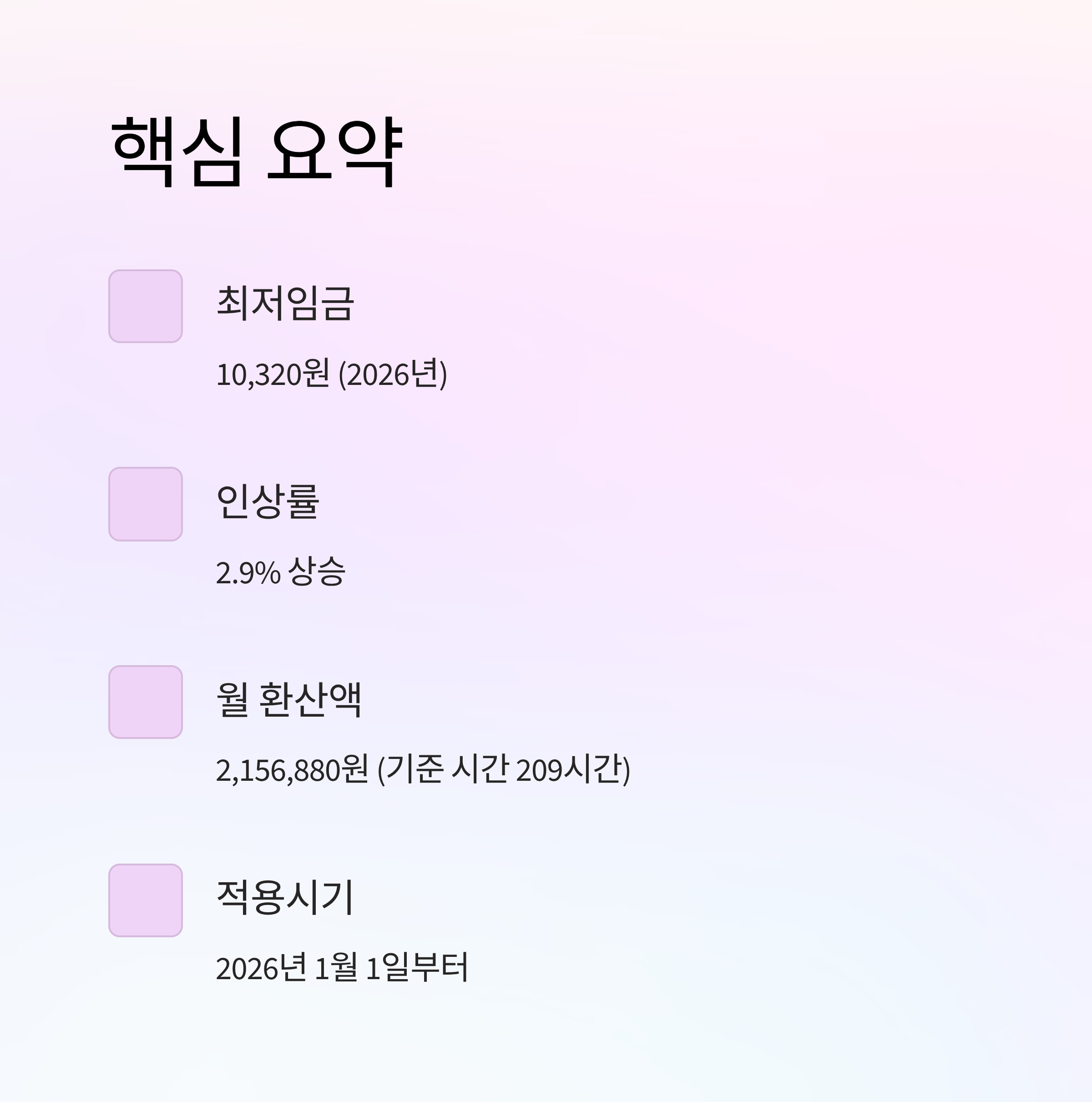 2026년부터 적용되는 최저임금이 확정되었습니다. 최저시급 10,320원, 인상폭 290원(2.9% 인상), 월 환산액 2,156,880원 등 주요 항목을 꼼꼼히 정리해 드립니다.