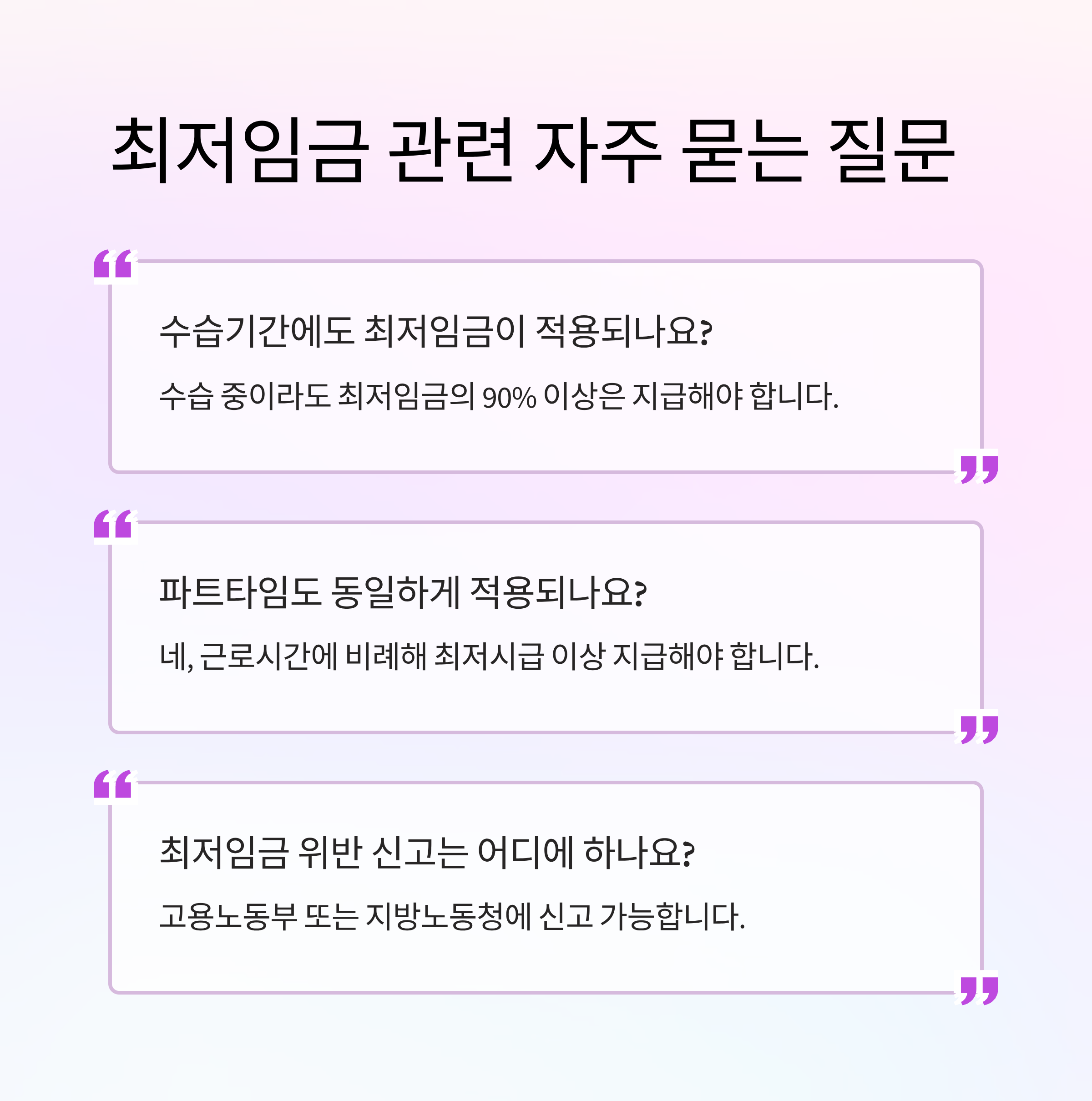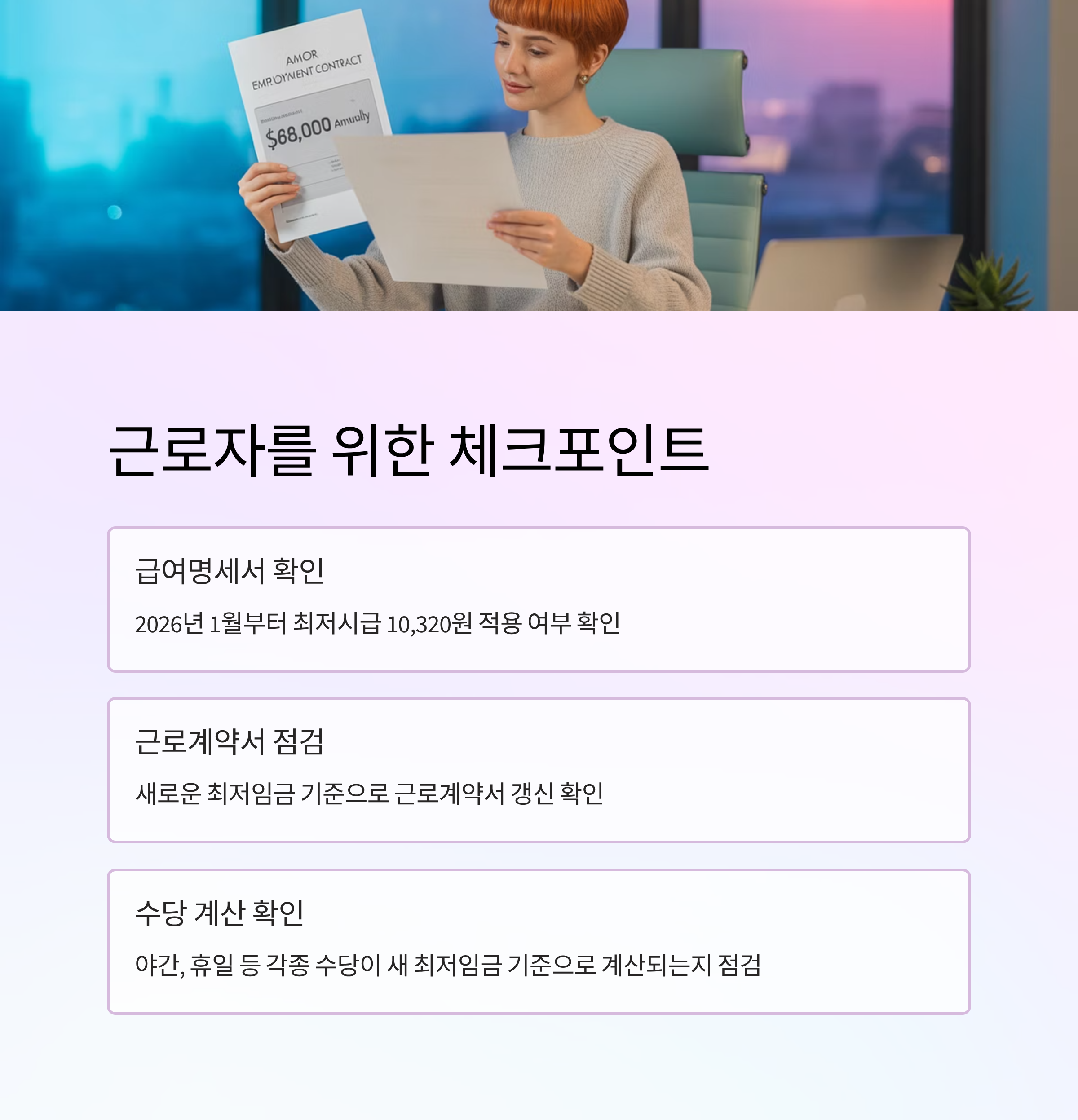 - 계약서, 급여명세서 등에서 최저시급 준수 여부 확인 권고