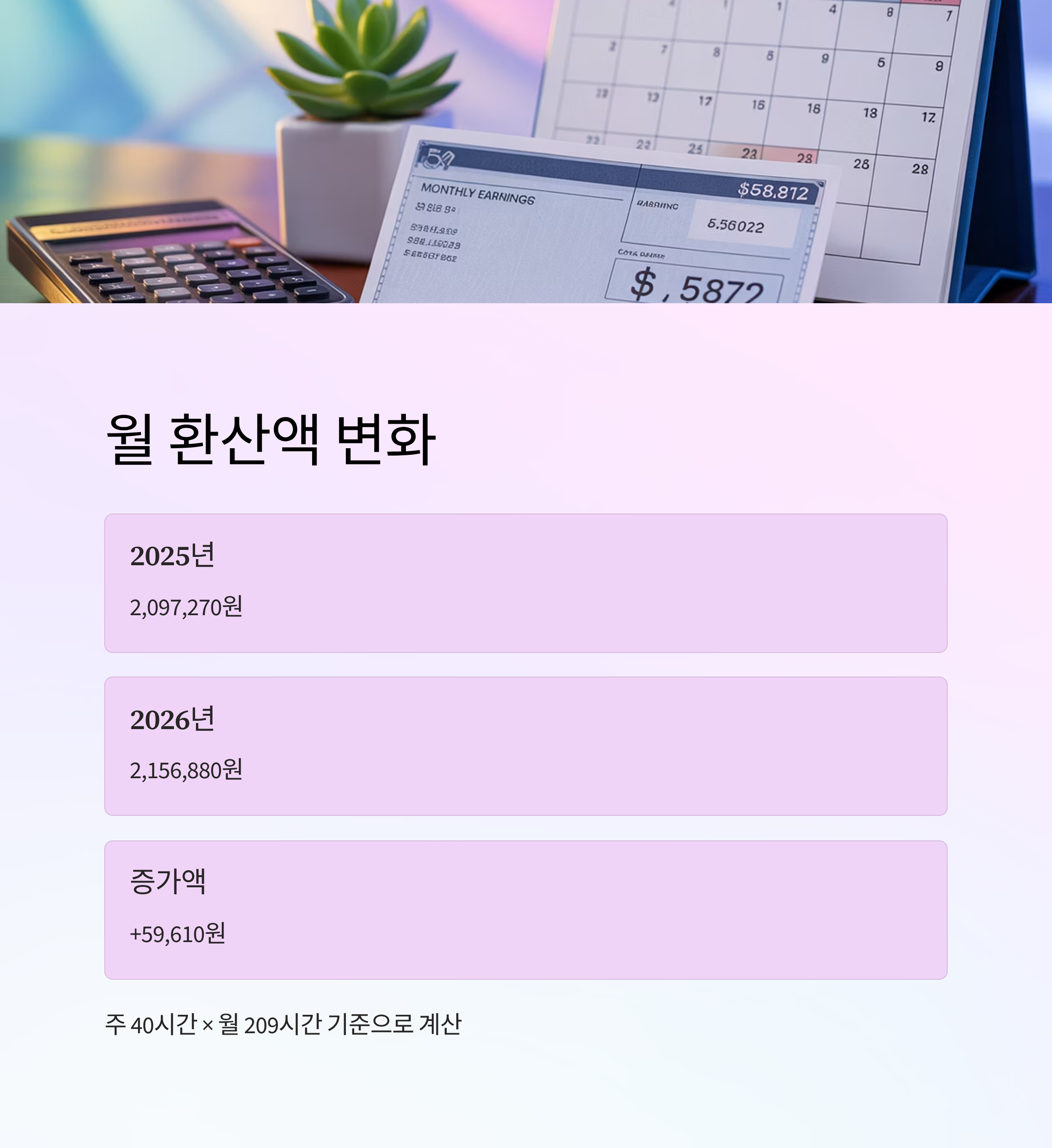 | 월 환산액 | 약 2,097,270원 | 약 2,156,880원 | +59,610원 |