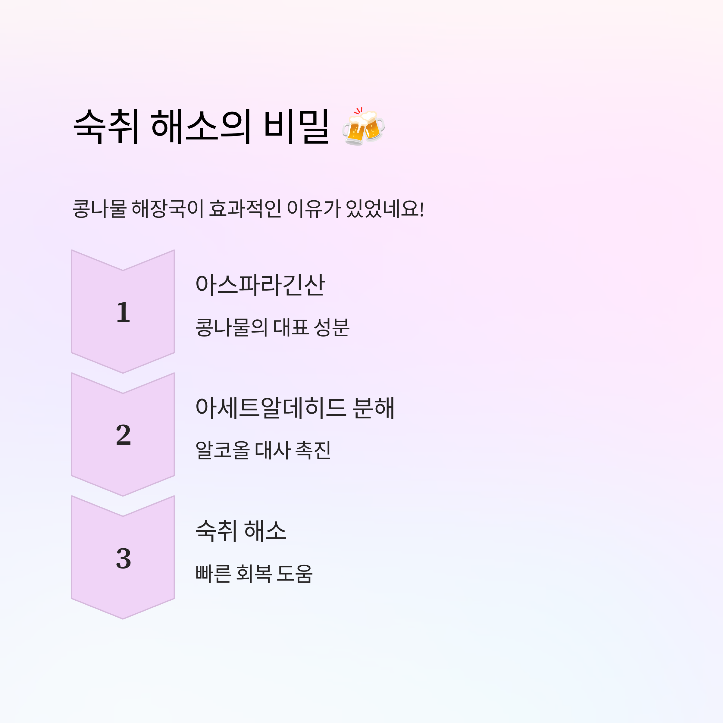 콩나물의 대표 성분 아스파라긴산은 알코올 대사 과정에서 생기는 아세트알데히드를 분해해 숙취 해소에 탁월합니다. 해장국에 콩나물이 빠지지 않는 이유죠.