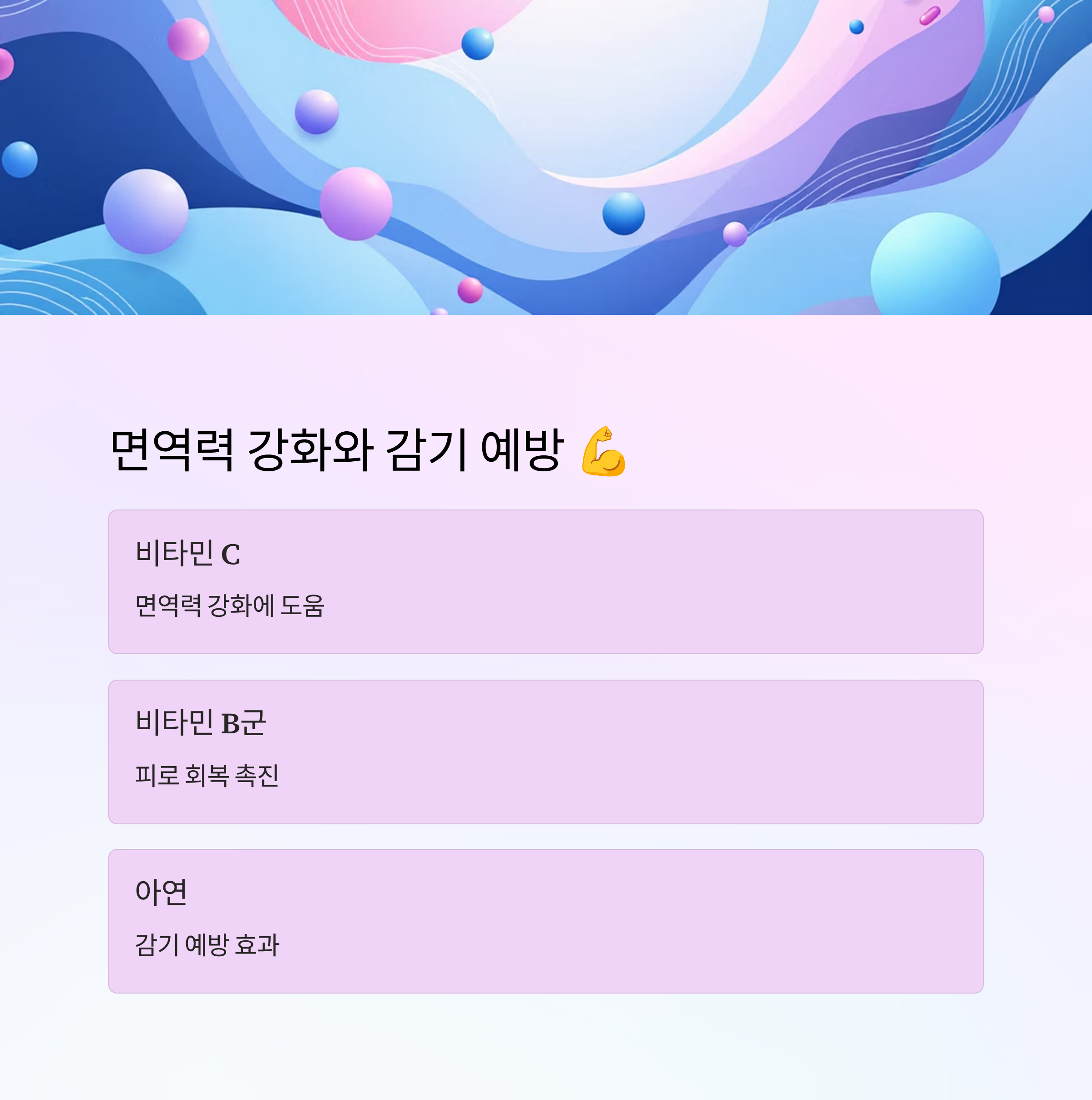 콩나물에는 비타민C, B군, 아연이 풍부하게 들어 있어 피로 회복과 면역력 강화에 도움을 줍니다. 특히 감기 예방과 피로 회복에 효과적입니다.