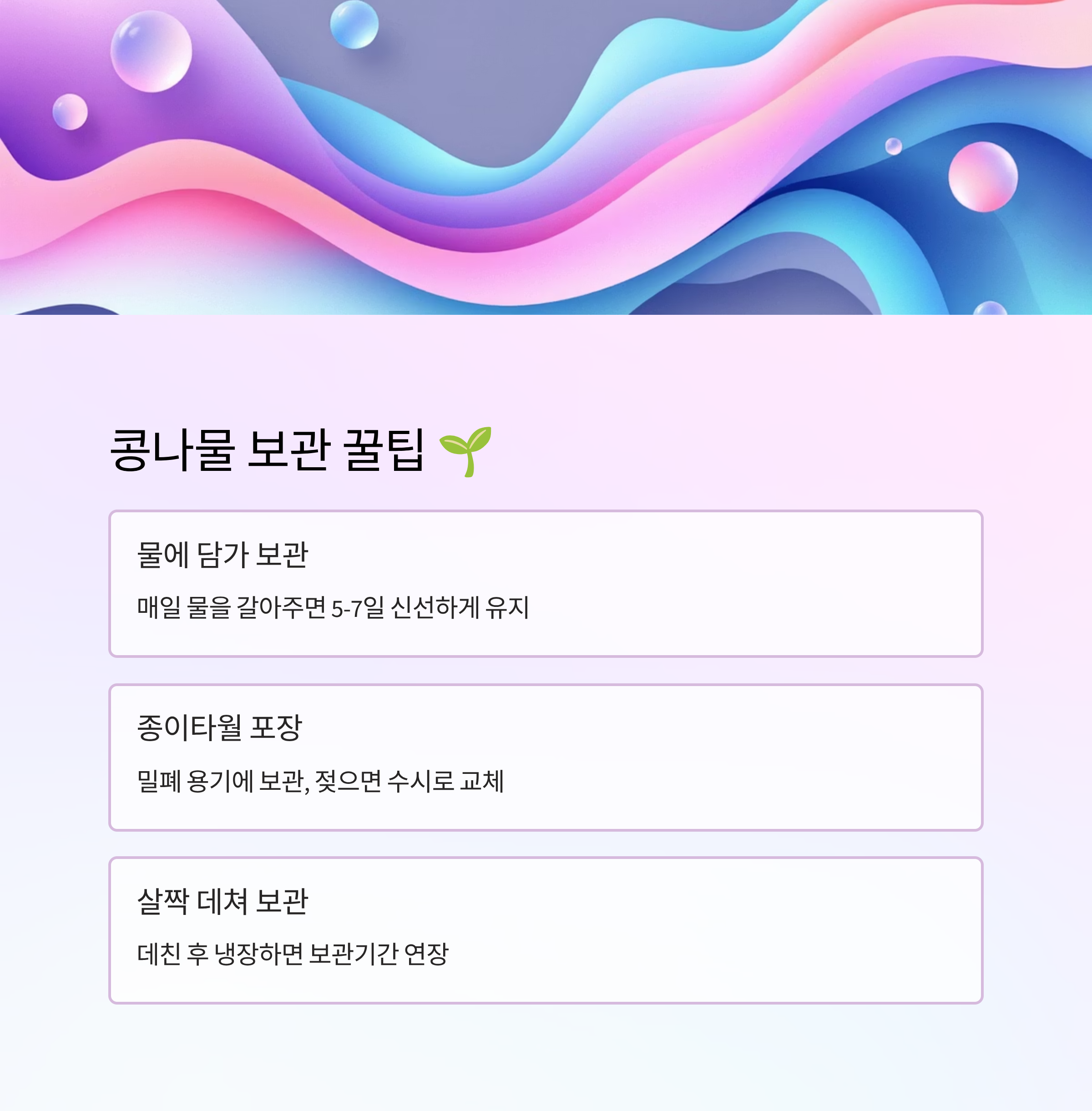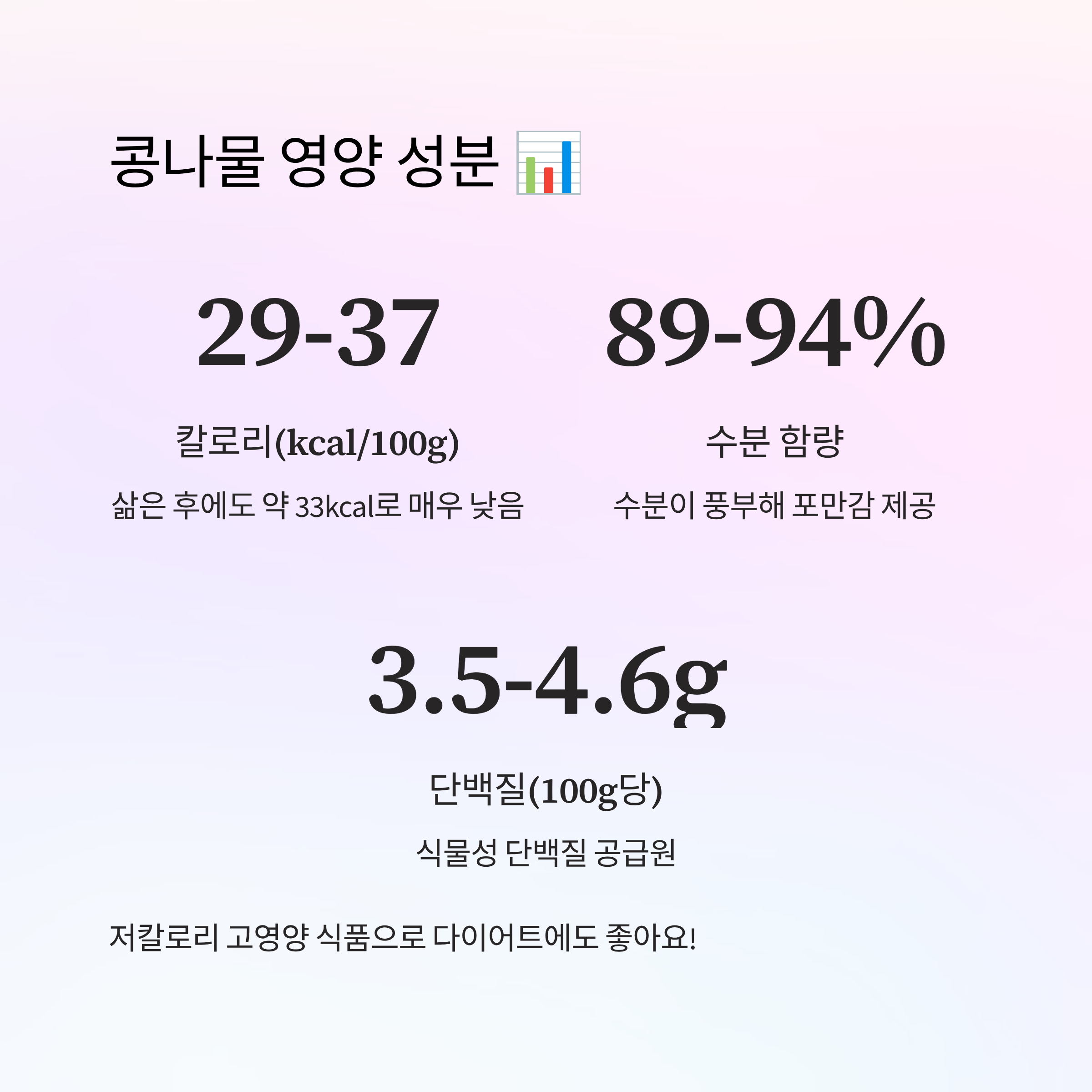콩나물은 저칼로리지만 고영양 식품으로, 꾸준히 섭취하면 다양한 건강상 이점을 누릴 수 있습니다. 단, 위장에 민감하신 분들은 적정량을 지켜드시고, 올바른 조리법과 보관법을 함께 활용해 보세요. 건강한 식탁, 콩나물로 시작해보는 건 어떨까요?