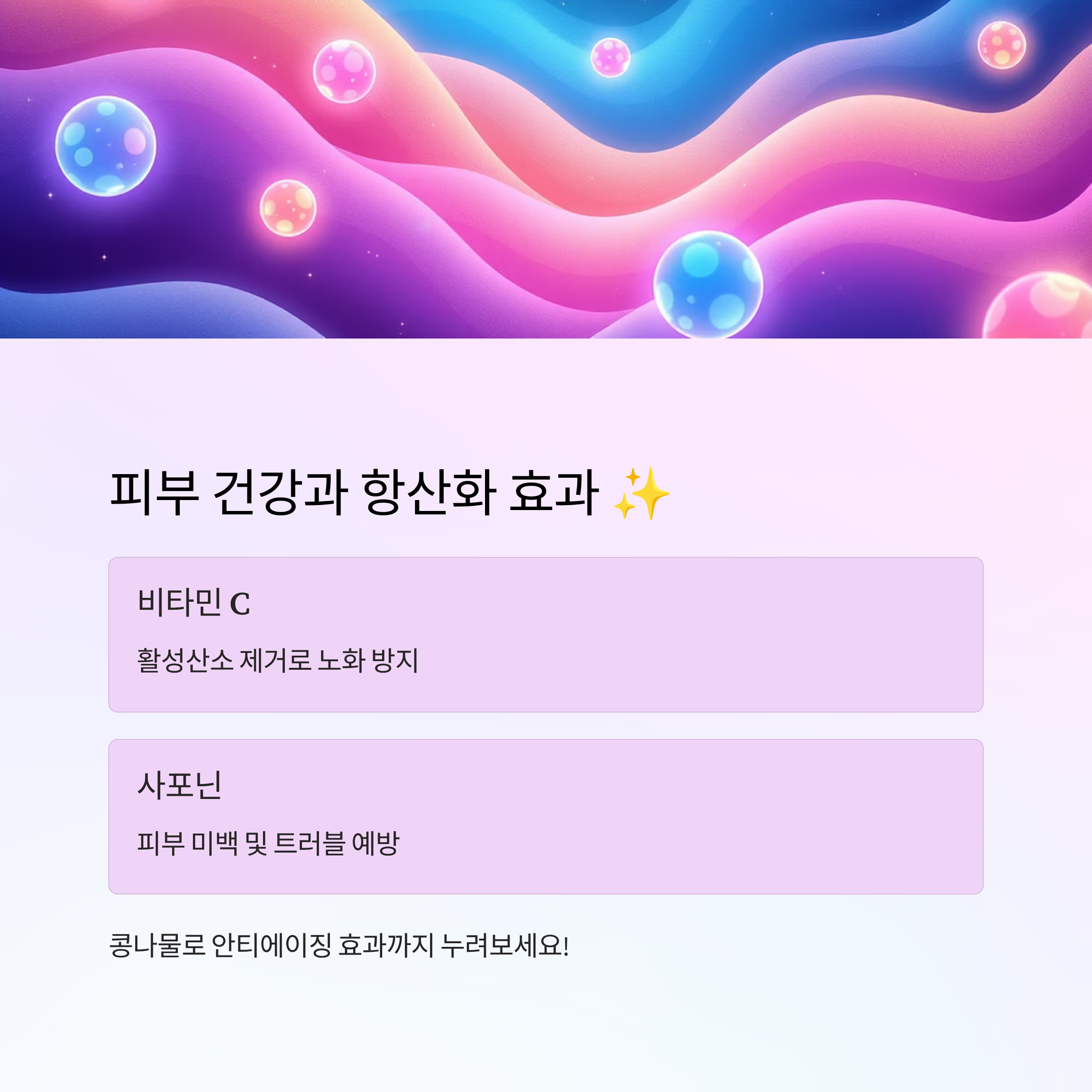 비타민C와 사포닌이 활성산소를 제거해 노화를 늦추고, 피부 미백 및 트러블 예방에 도움을 줍니다.