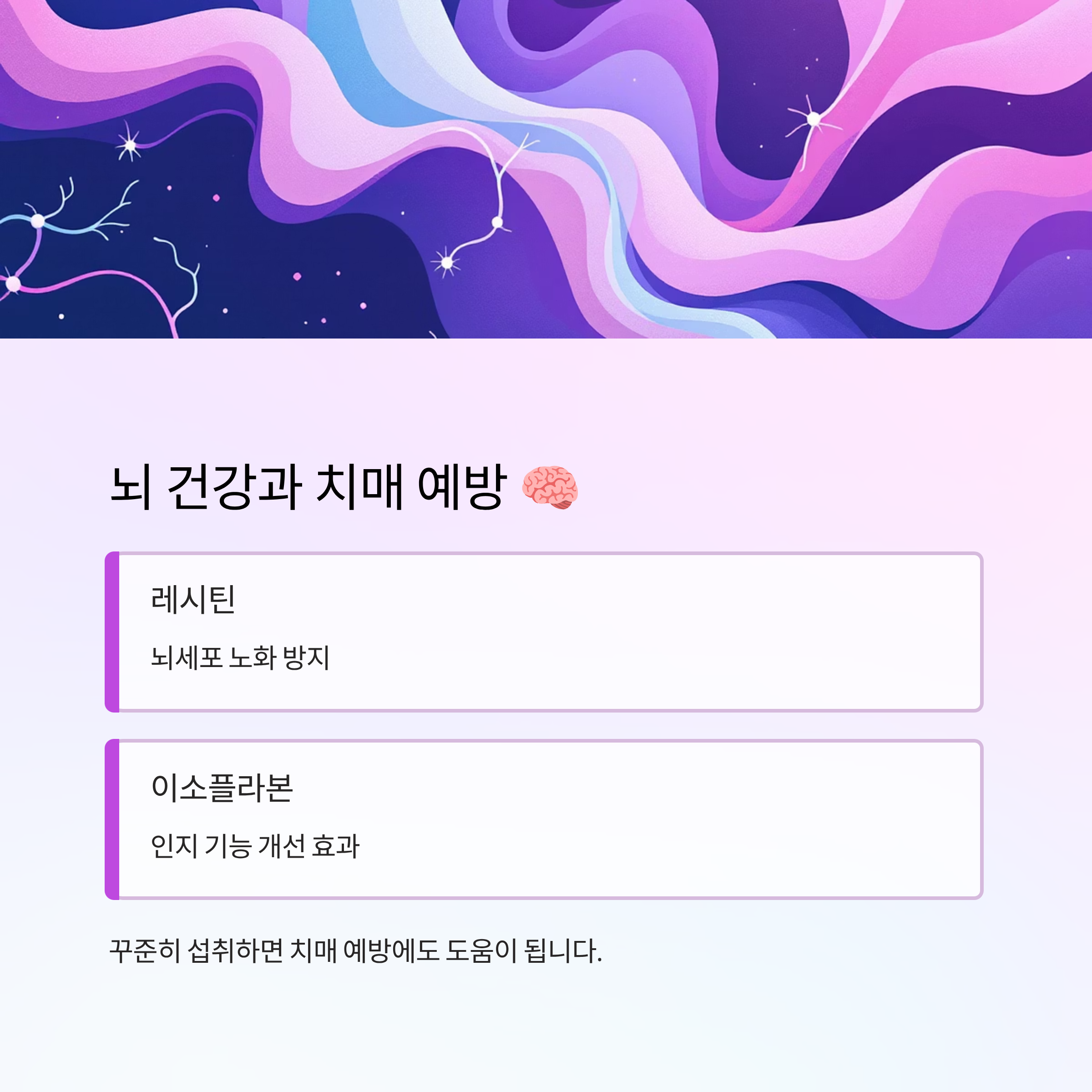 레시틴과 이소플라본은 뇌세포 노화를 막고 인지 기능을 개선해 치매 예방에 긍정적 영향을 줍니다.