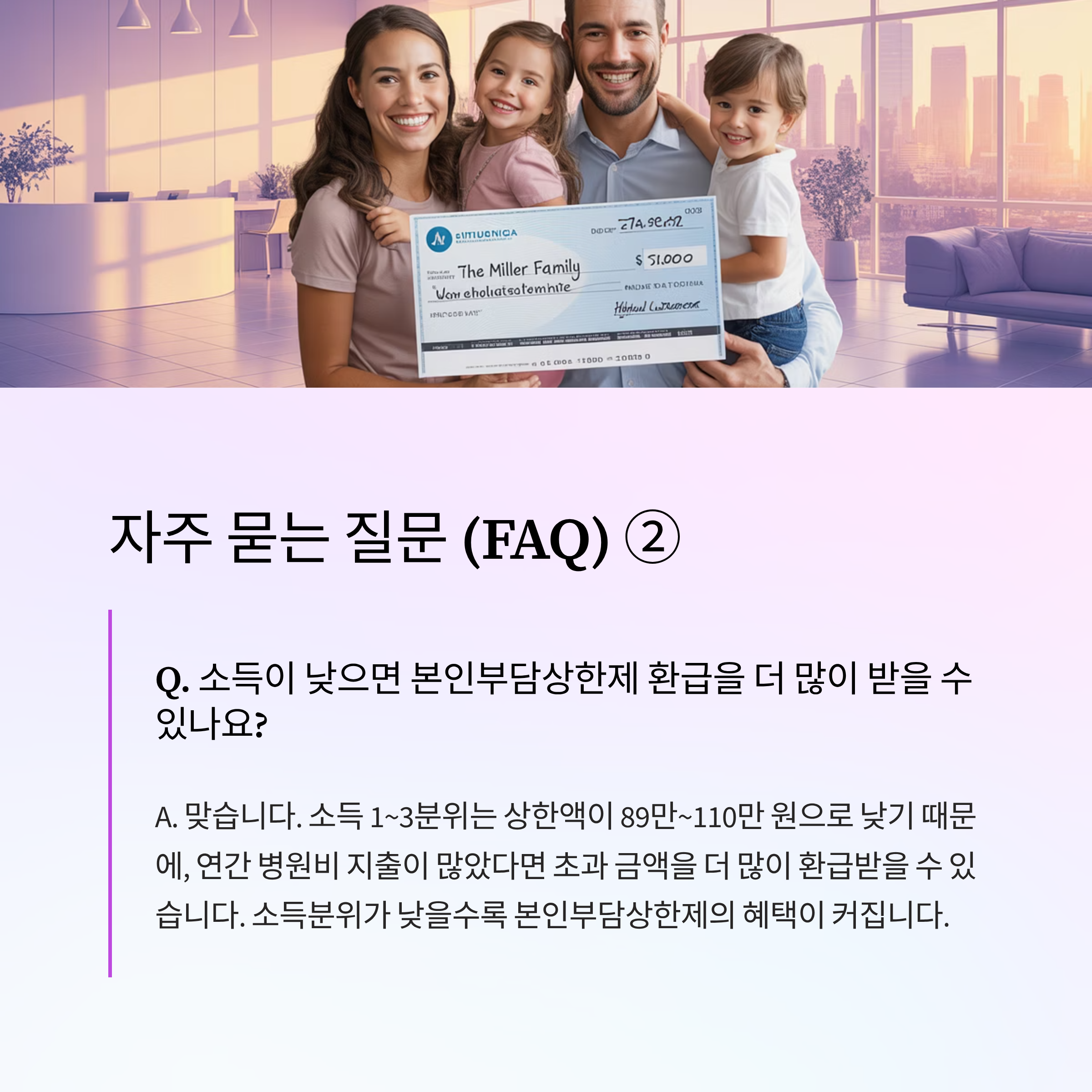 A2. 맞습니다. 소득 1~3분위는 상한액이 89만~110만 원으로 낮기 때문에, 연간 병원비 지출이 많았다면 초과 금액을 더 많이 환급받을 수 있습니다. 콕 집어 말하자면, 소득분위가 낮을수록 본인부담상한제의 혜택이 커집니다.