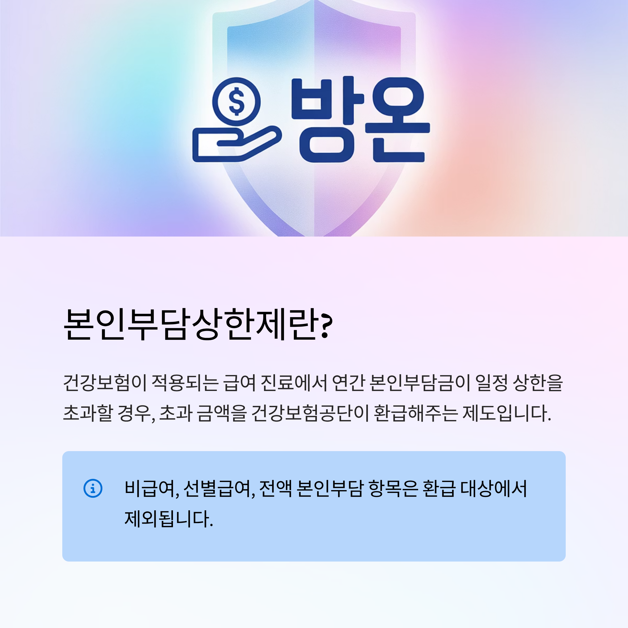 - 본인부담상한제는 연간 급여 의료비가 소득분위별 상한액을 초과할 경우 초과분을 환급받는 제도입니다.
