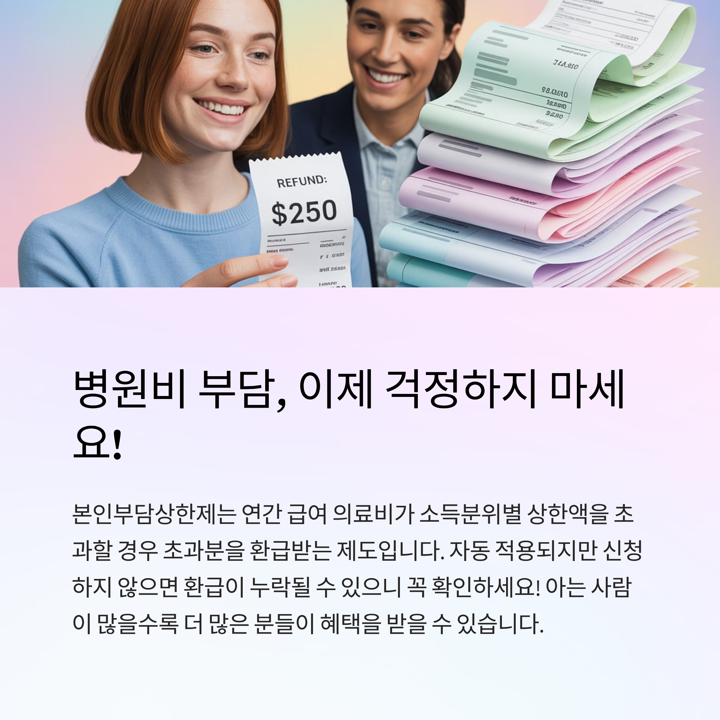 - 건강보험이 적용되는 급여 진료에서 연간 본인부담금이 일정 상한을 초과할 경우, 초과 금액을 건강보험공단이 환급해주는 제도입니다.